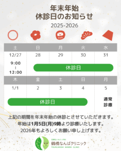 鶴橋なんばクリニックは、下記の期間を年末年始の休診日とさせていただきます。